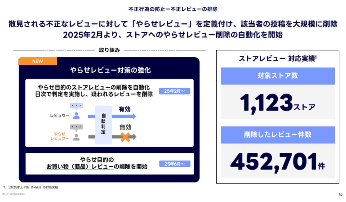 2025年2月よりLINEヤフーはストアの評価を不正に操作する目的で投稿される「やらせレビュー」の自動削除を開始した。日次でレビューを自動判定し、疑われる該当者のレビューを削除している。2025年6月からは商品レビューに対しても同様の措置が講じられるようになり、2025年上半期のうちに1123ストアで45万2701件のレビューを削除した。