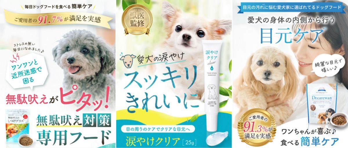 アニマルライフ研究所が販売する商品。左から「無駄吠えのしつけプラス」 「涙やけクリア」 「Drケアワン」