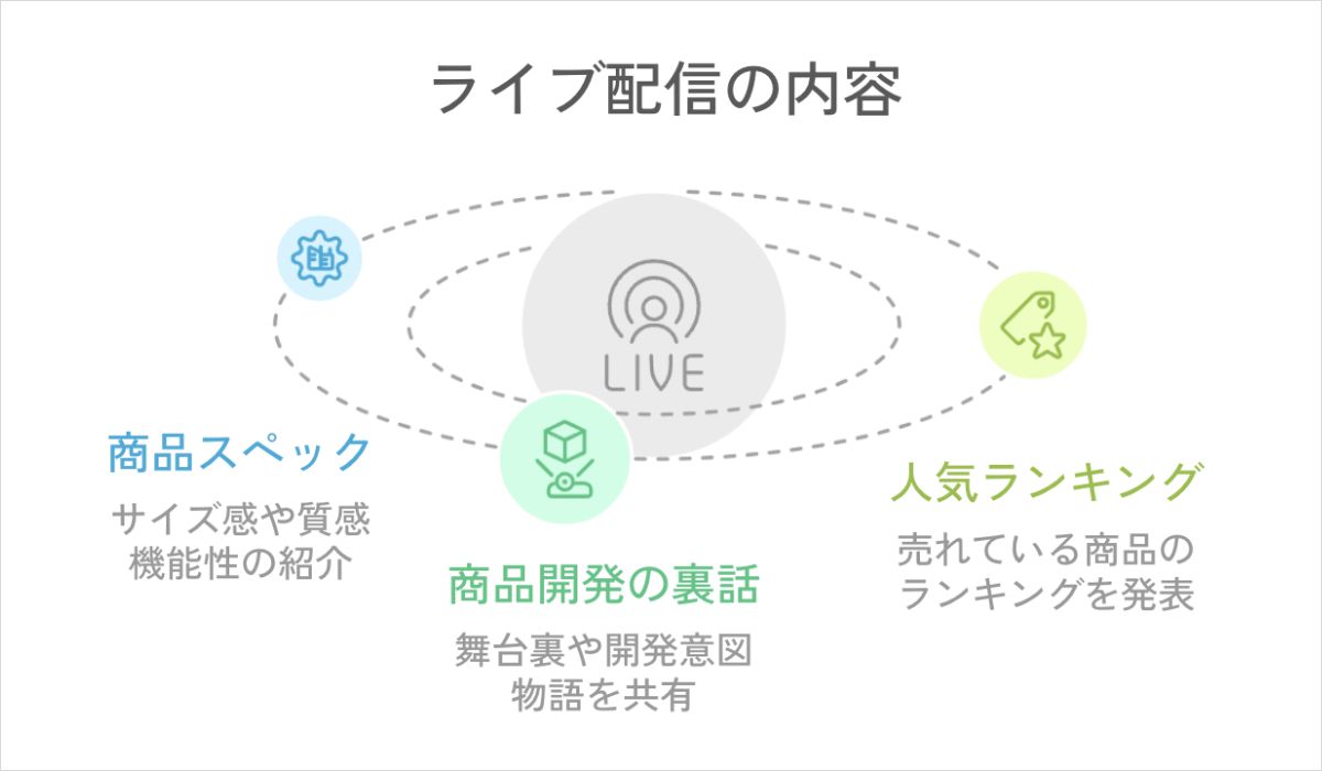 効果的なライブ配信の内容は、商品スペック・商品開発の裏話・人気ランキングが代表的なものになる
