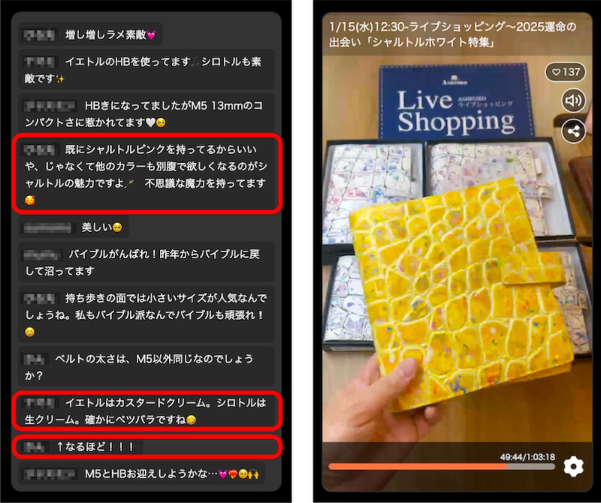 今回のライブは数十人がリアルタイムで視聴し、コメントも大いに盛り上がった。冒頭から「実物がじっくり見られるというのでとても楽しみにしてました!!」といったコメントが次々と投稿され、ライブを楽しみにしていた顧客の熱量が伝わってくる。また、「すでにシャルトルピンクを持っているからいいや、じゃなくて他のカラーも別腹で欲しくなるのがシャルトルの魅力ですよ 不思議な魔力を持ってます」というコメントも。