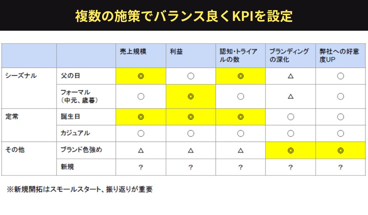 例えば、中元・歳暮のようなフォーマルギフトでは「利益」を、売上規模の大きい父の日ギフトでは「売上」と「認知・トライアル数」をKPIに置く。一方で、「卒乳祝い」のようなブランドの世界観を伝えるニッチなギフトは、「ブランディングの深化」や「会社への好意度UP」といった、直接的な売上とは異なる指標で評価する。