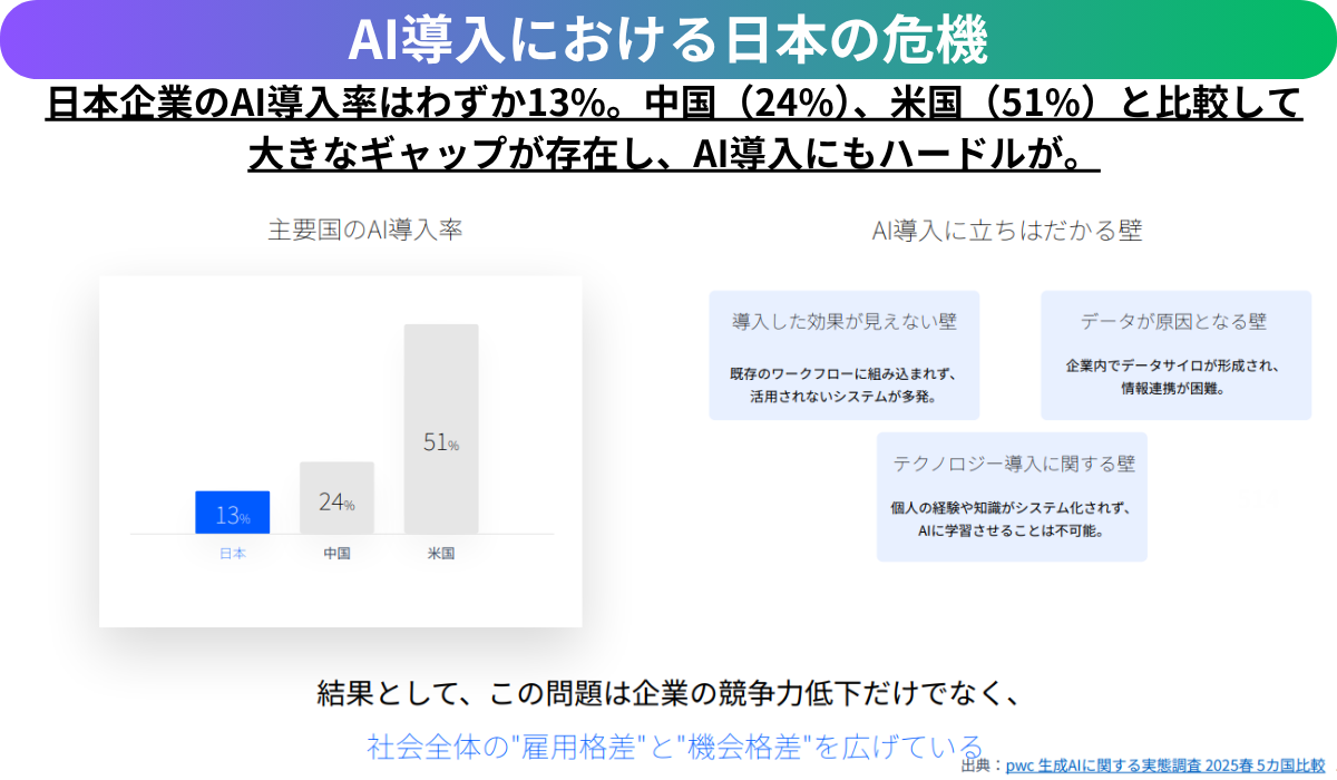 顧客満足度が経営に直結する現在、CSは投資の対象として認識されつつあり、同時にAIの初期導入先として相性が良いと野村氏。一方で日本企業では「AIの導入効果が見えづらい」「DX不足でAIが構造データを使えない」「現場にノウハウが埋もれている」という課題から、導入が米国などに比べて遅れている。