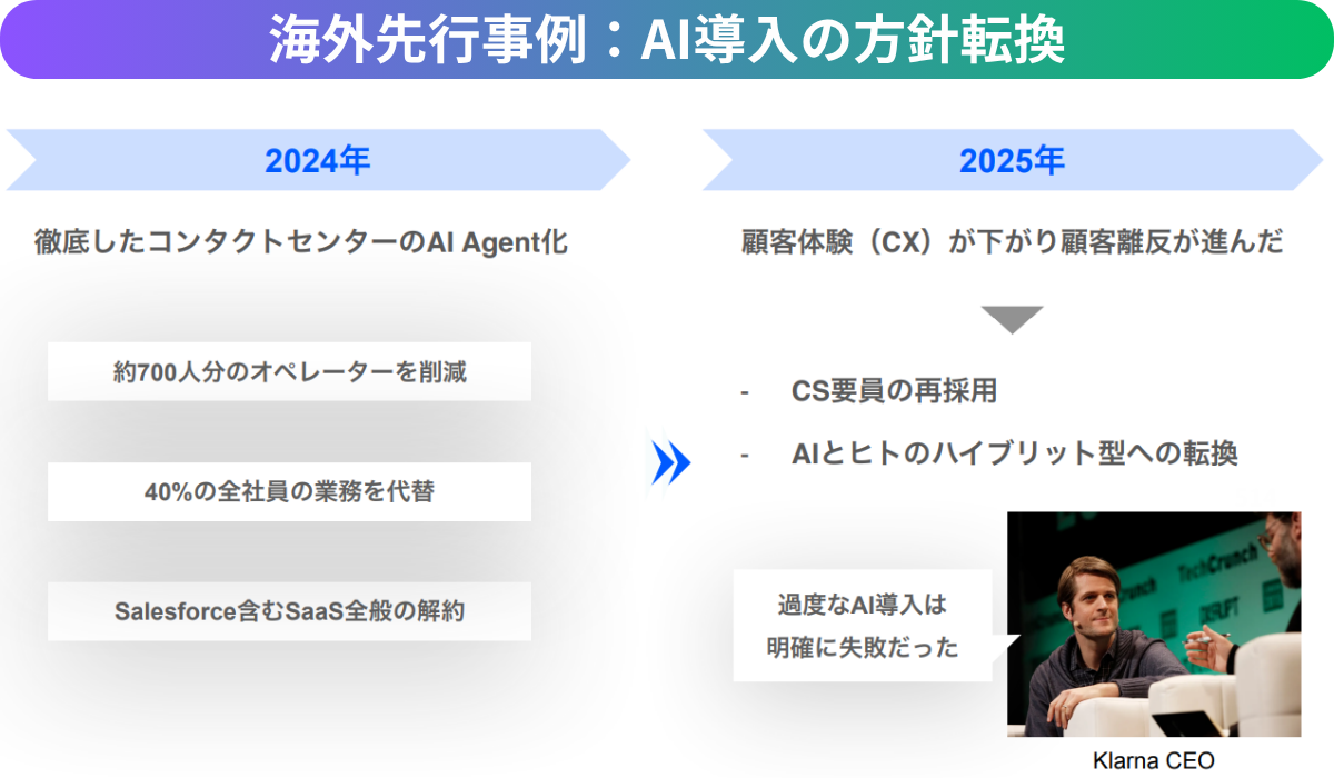 AIの活用が進む一方で、実装に失敗した事例も見られる。野村氏はEC向けの後払い決済サービス「Klarna」の事例を紹介。2024年にコンタクトセンターをAIエージェント化した同社は、品質が問題となって顧客離反が進み、2025年にAIとヒトのハイブリット型へ方針転換した。