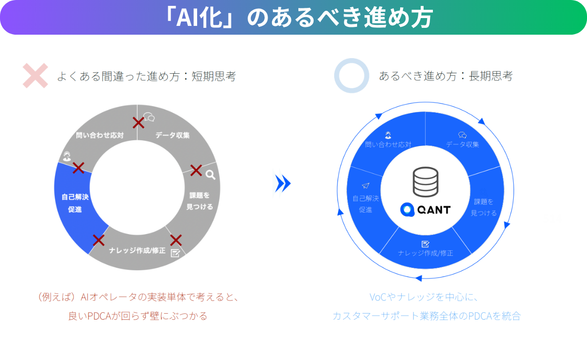 コンタクトセンターを部分的にAIで代替する試みは、PDCAがうまく回らないという。顧客は最初に困りごとが発生しており、自己解決できない場合に問い合わせる。事業者は対応後に得られたナレッジやVoC(顧客の声)をサービスやWebサイトなどへフィードバックする。