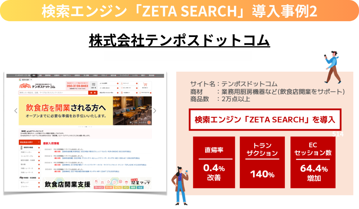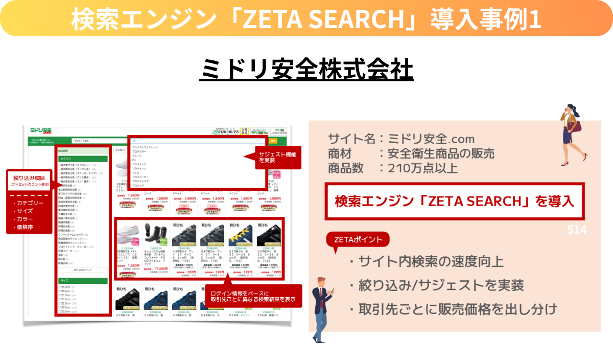 実際にZETAが提供する検索エンジン「ZETA SEARCH」などを導入した企業は、販促効果の向上を実現している。防災系の商品を扱うミドリ安全株式会社では、商品点数210万点以上を扱うサイトで検索結果の精度と速度が向上した。