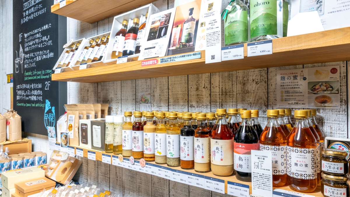 直営店「千年こうじや」では、日本酒をはじめ、八海山の麹を使った「だし」や「ポン酢」に「酒粕パンケーキミックス」など、発酵の恵みを味わえる商品が並ぶ