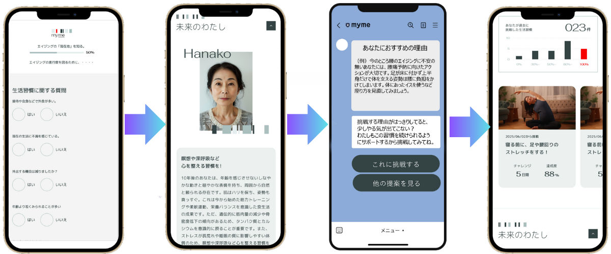 mymeはこの分断を埋めるため、AIがデータに基づいた「未来の自分からのメッセージ」を届ける“橋渡し役”になる。