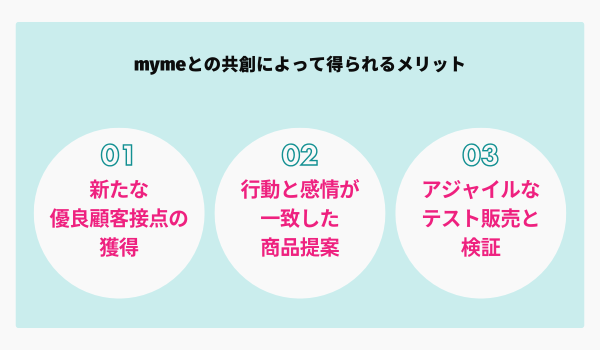 1つ目のメリットは、従来の販路ではアプローチが難しかった健康意識の高い層とつながることだ。広告やキャンペーンへの依存度を下げ、信頼ある文脈の中で、新しいマーケティング基盤を構築できる。2つ目は、myme上での商品との出会いがユーザーにとって「行動と感情が一致した選択」になること。商品が行動変化のストーリーの一部として組み込まれることで、ユーザーは単なる物販ではなく、前向きな自己投資として認識するため、広告に頼らない購買動機を醸成できる。
