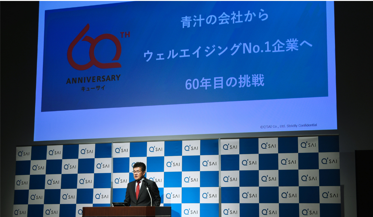 キューサイの60年の歴史を振り返り、「『ウェルエイジングな生き方』の浸透、普及は単なるスローガンではなく、今後展開していく事業の根幹であり、社会に対する約束」と強い決意を語った代表取締役社長の石川順朗氏