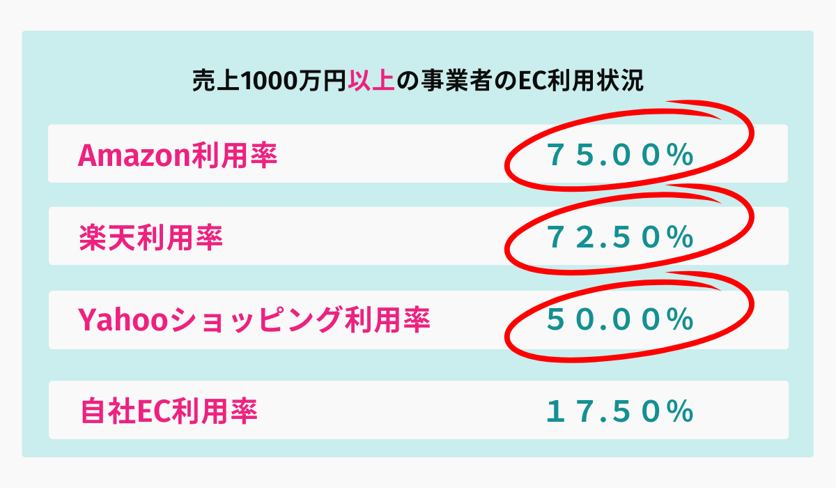 一方で、年商1000万円を超える事業者の7割は、Amazon、楽天、Yahoo!の三大モールに出店していた。つまり、事業をスケールさせるにはモールの集客力が不可欠だが、そこには人材・ノウハウ不足という“1000万円の壁”が立ちはだかっていたのだ。