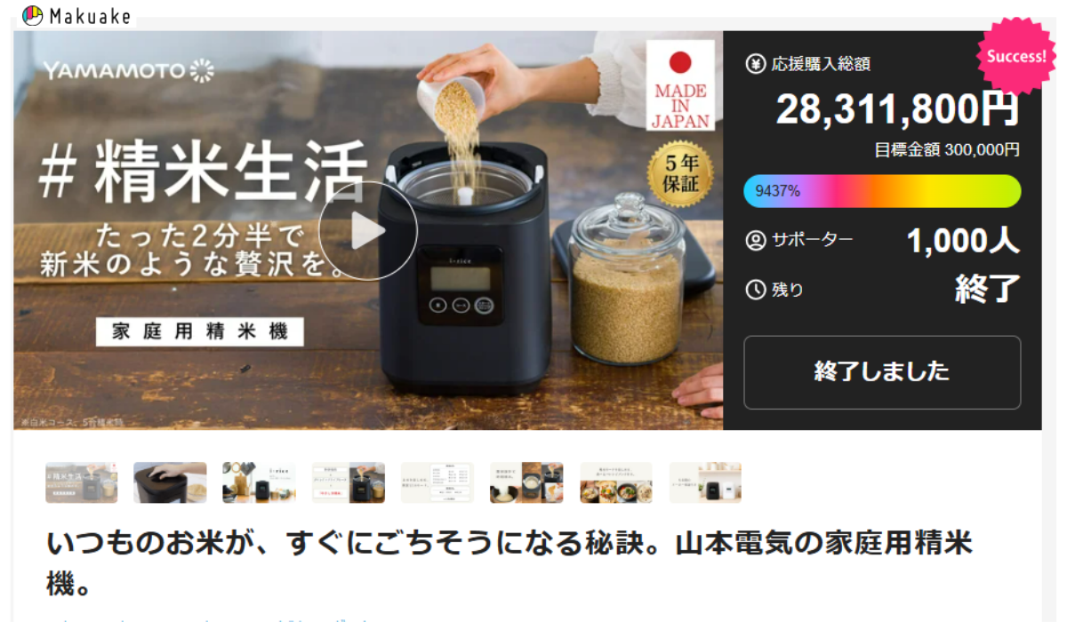 家庭用精米機「i-rice(アイライス)」は、2025年8月にクラウドファンディングサイト「Makuake」で先行販売を実施。開始からわずか3時間で予定台数を完売した(画像出典:Makuakeプロジェクトページ)