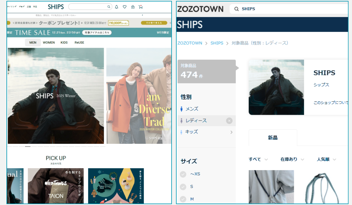 (左)SHIPS公式サイト、(右)ZOZOTOWN「SHIPS」店舗