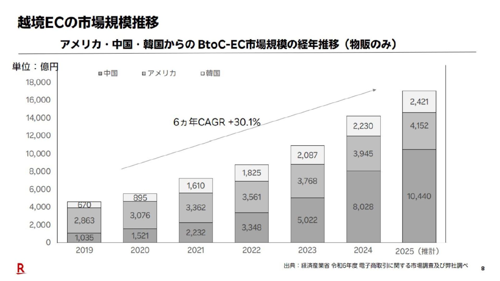 日本在住者が購入している海外からの越境ECは、2019年から2025年の6年間で年平均30.1%成長しており、2022年からの成長率が0.65ポイントの国内ECを大きく上回る。楽天は2025年における米国、中国、韓国からのB2C越境EC総額が1兆7000億円に達すると見る。