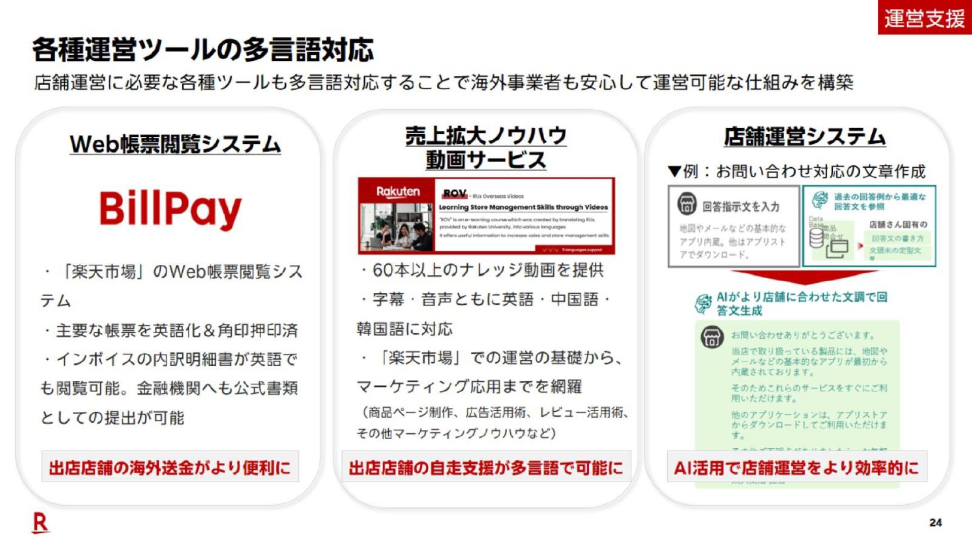 帳票閲覧システムの英語対応や、ナレッジ動画の多言語対応、RMS(Rakuten Merchant Server)へのAI実装など、システム面の拡充も進む。また、店舗同士で情報を共有できる「NATIONS」の越境EC版となる「NATIONS GLOBAL」が2026年3月に始まる。これによって、「海外事業者が積極的に参加し、売上を伸ばすためのアクションを取りやすくなる」と大原氏は語る。