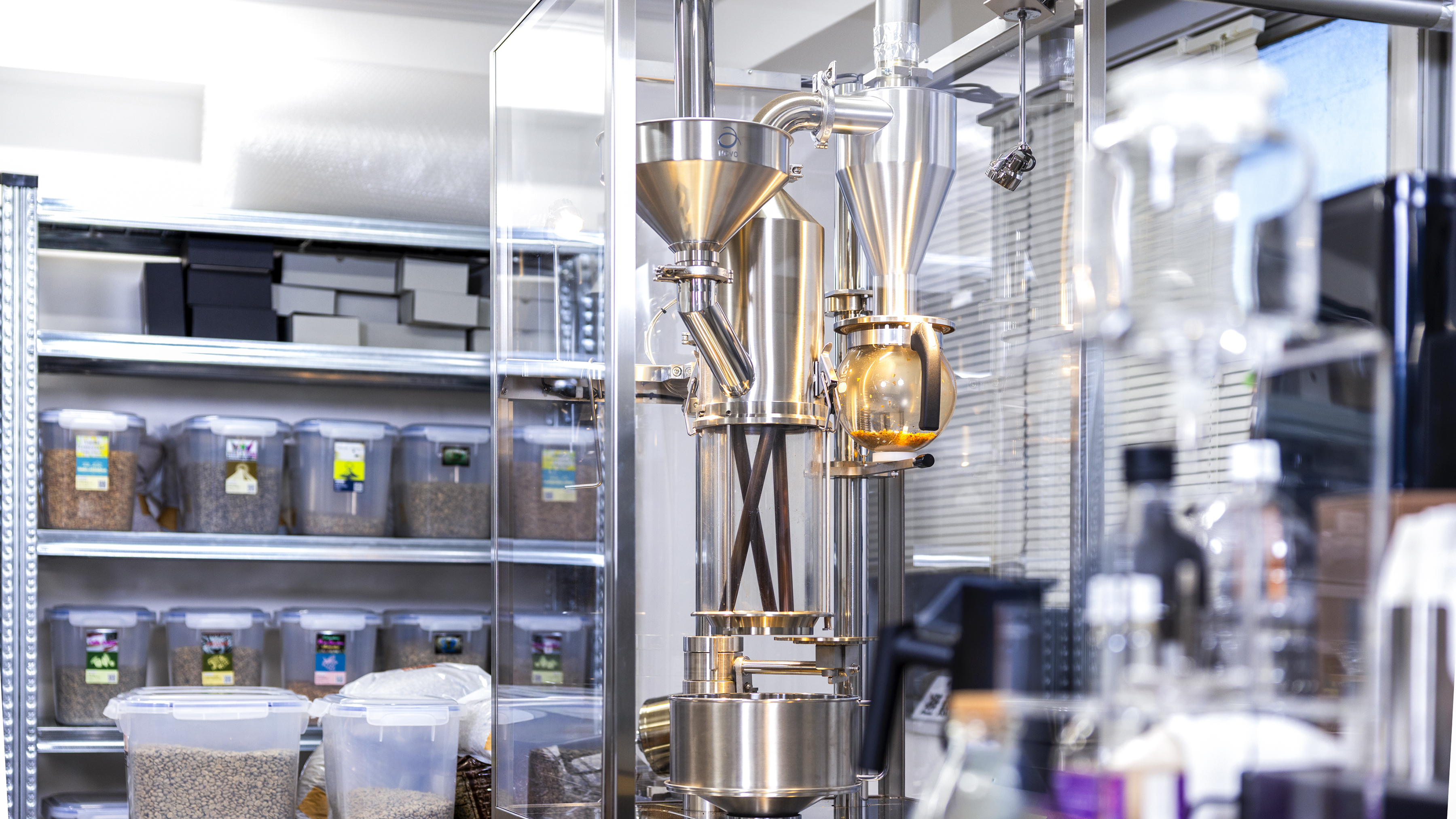 東京本社内に設置されたコーヒーの焙煎機。さまざまな種類の生豆も並ぶ