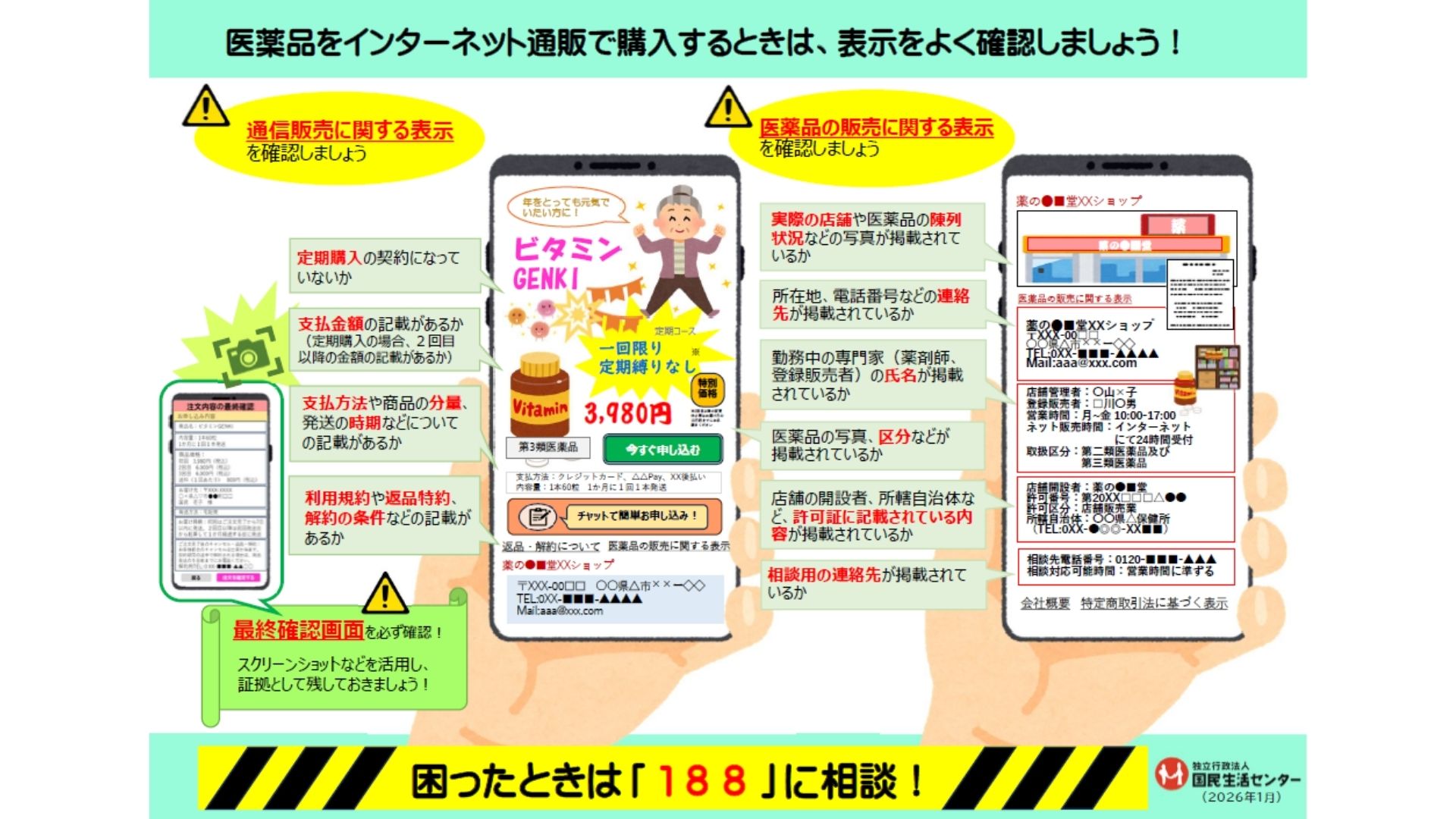 中でも、②に関しては【トラブルになった時にそなえ、自分が見た広告表示や最終確認画面のスクリーンショットを撮り、契約時の条件を証拠として保存しておくようにすること】、③に関しては【特に、持病のある場合や日常的に使用している医薬品がある場合、新たに医薬品を使用する際には注意が必要。医薬品を購入する前に、薬剤師やかかりつけ医などの専門家に相談すること】をすすめている。