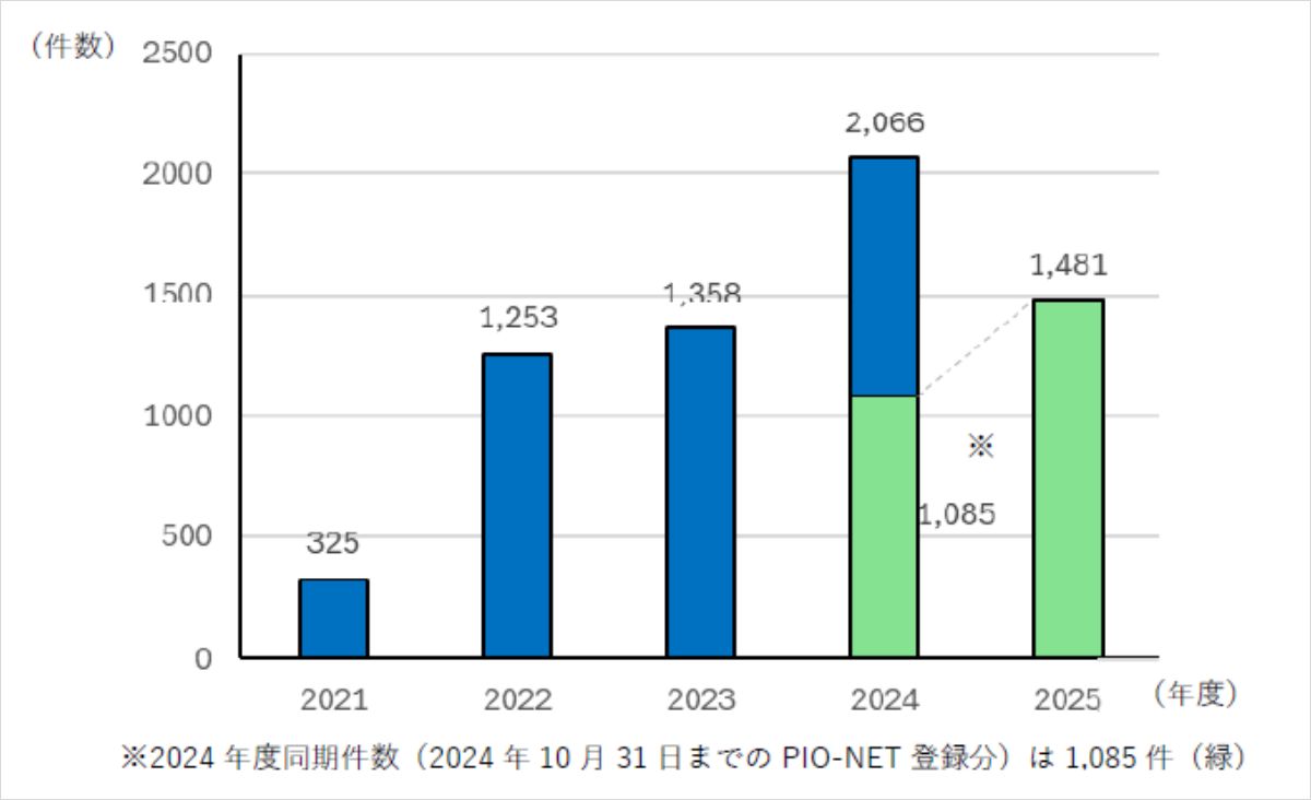 ※PIO-NET(パイオネット:全国消費生活情報ネットワークシステム)は、国民生活センターと全国の消費生活センター等をオンラインネットワークで結び、消費生活に関する相談情報を蓄積しているデータベースのこと。相談件数は2025年10月31日までの登録分。消費生活センター等からの経由相談は含まれない。なお、PIO-NETにおける「医薬品」には、一般用医薬品のほか、一部の医薬部外品を含む。相談件数は、インターネット通販での定期購入に関する相談のうち「医薬品」に関するものを集計している