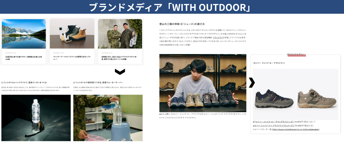 「WITH OUTDOOR」は、検索流入を起点にエントリー層との接点を広げることを目的としたオウンドメディアであり、靴の選び方などの入門記事に加え、防災×アウトドアといった周辺文脈を取り入れたコンテンツを展開している。