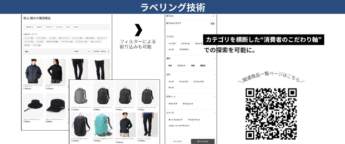 商品画像を解析し、素材・機能・着用シーン・体験価値などの特徴を自動でハッシュタグ化。「#登山」「#撥水」「#通勤」といったタグを通じて、カテゴリを横断した商品一覧へと誘導する仕組みを構築した。