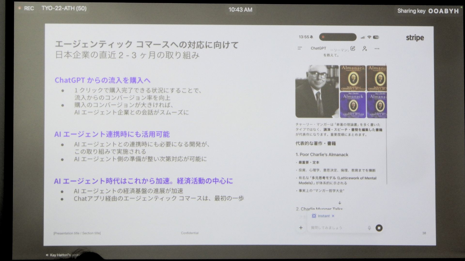 Stripeが現在進めている取り組みは、ChatGPT経由でアクセスした人がワンクリックで購入できる導線を作ることだ。「これにより、将来インスタントチェックアウトが始まった際にも、スムーズに移行でき、社内投資も得やすくなる」(安部氏)。