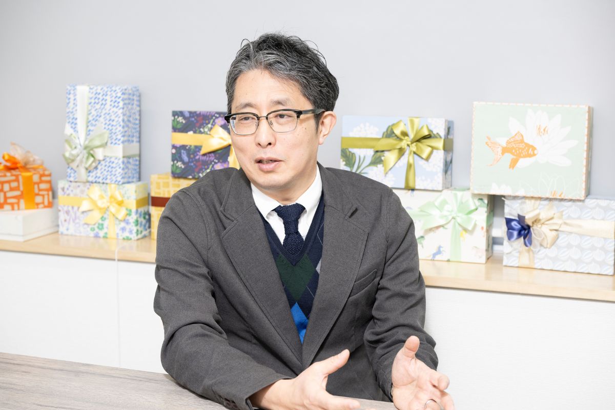 株式会社マルニ・ロジコム 代表取締役 杉山慎一氏。オフィスには美しいギフトラッピングが施された色とりどりのボックスが並ぶ