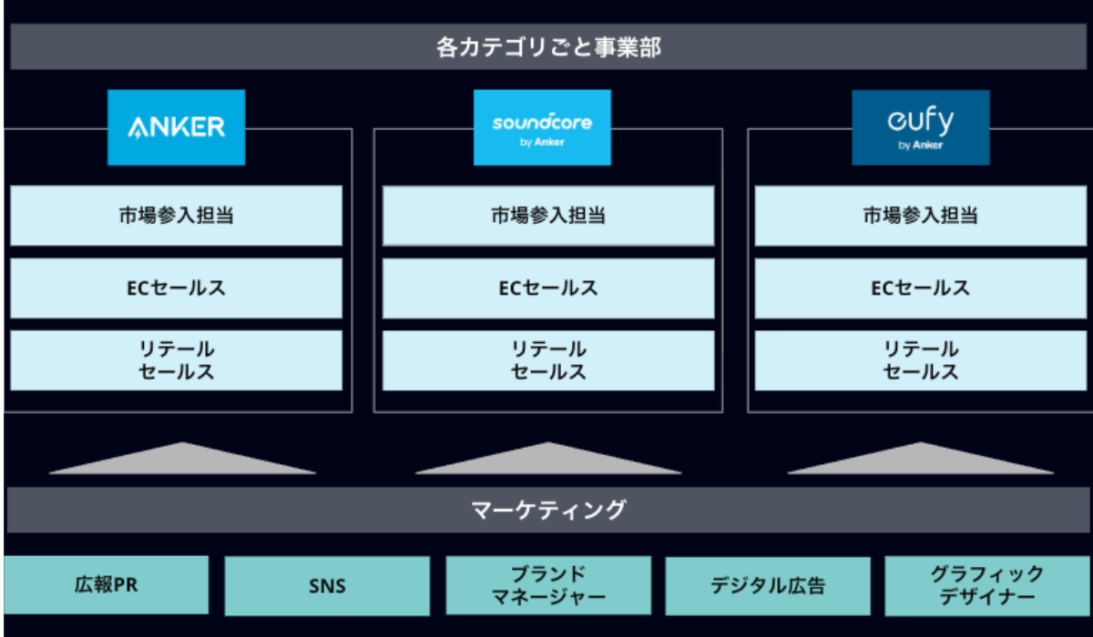 アンカー 芝原 グローバルを含めた根幹的な組織再編を行いました。以前は「ECチーム」「リテール(実店舗)チーム」といった販売チャネルごとの組織でしたが、これを「Anker」「Soundcorre」といった製品カテゴリ別の事業部型組織に変更しました。