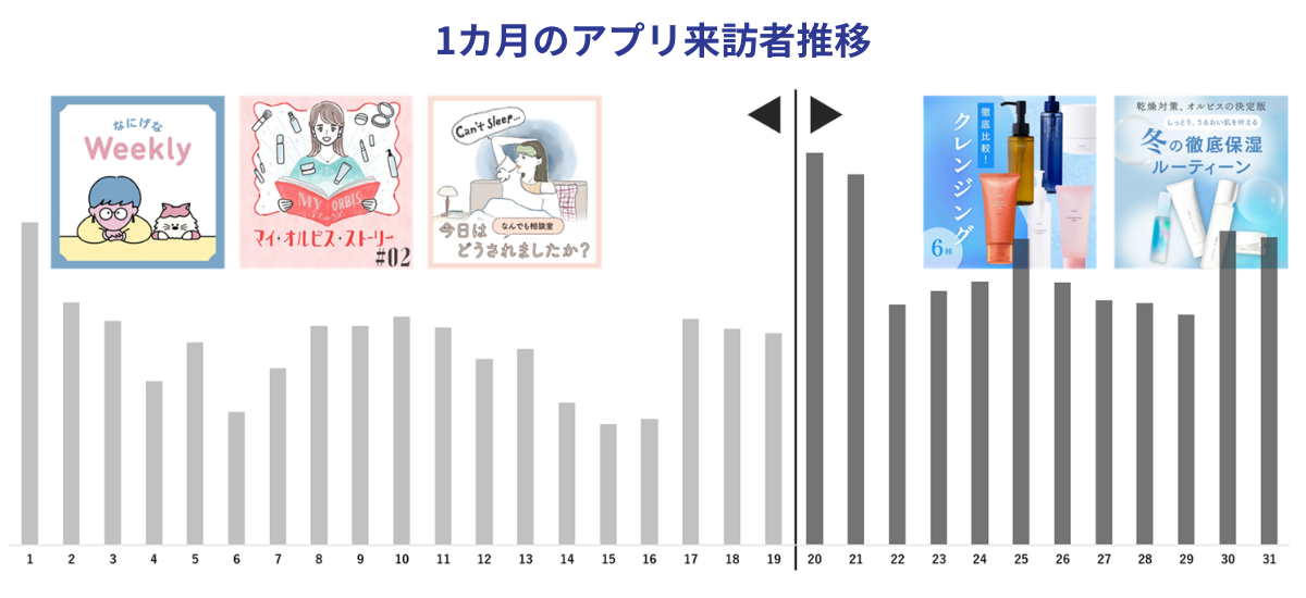 オルビスにおける1カ月のアプリ来訪数推移。新商品が発売になる20日のタイミングで通知内容が切り替わる