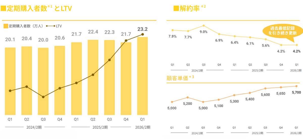 *3 各会計期間における3カ月間の平均値(Ql:3月~5月、Q2:6月~8月、Q3:9月~11月、Q4:12月~2月)、顧客月問平均単価=月間定期注文の売上/月問定期顧客数