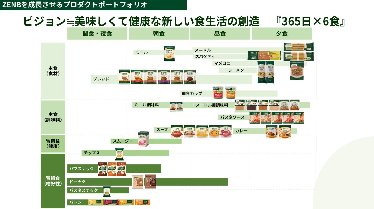 ZENBの特徴が「365日×6食」という独自の設計思想だ。朝・昼・晩・ブランチ・おやつ・夜食という6つの食機会をすべてカバーする商品群をそろえ、生活者の食卓に「網羅的に存在するブランド」を目指している。