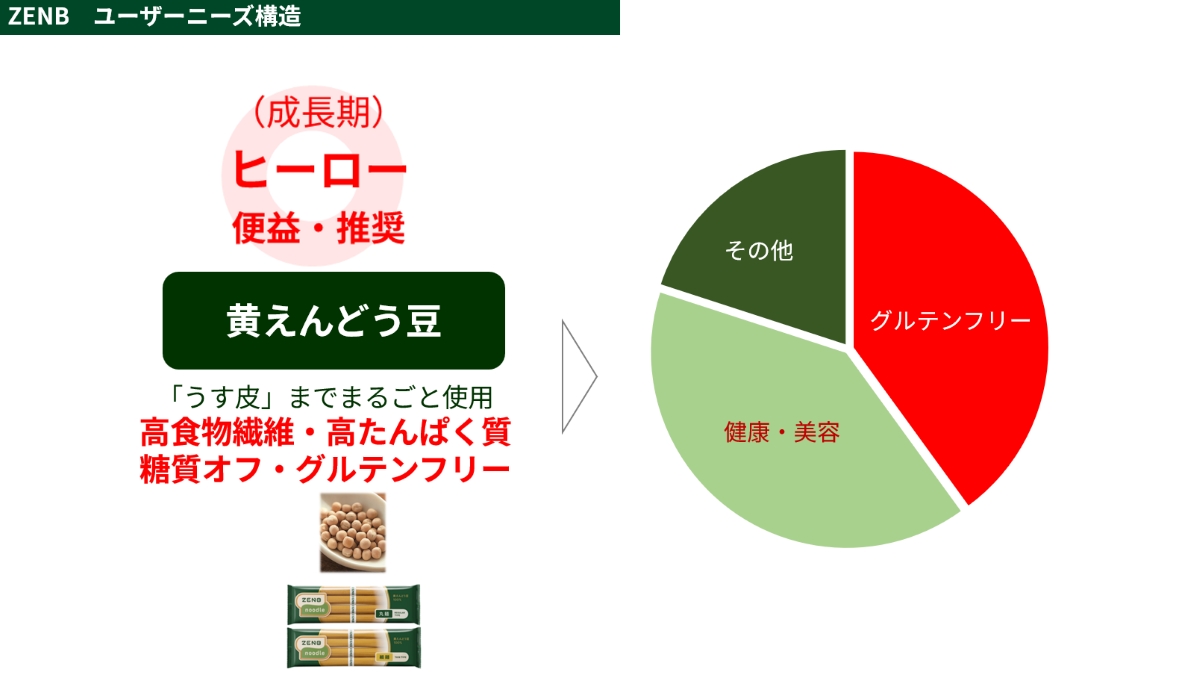 2021年からは定期モデルを本格的に開始。そのきっかけになったのが、黄えんどう豆を商品化できたことだという。高たんぱく・高食物繊維・糖質控えめ・グルテンフリー・NON GMOという、生活者にとって直接的な便益を持つことが特徴で、ZENBヌードルやZENBブレッドといった主力商品に採用されている。