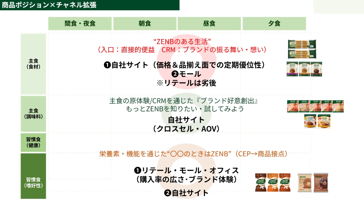 ZENBのチャネル戦略は、商品ポートフォリオの構造と密接に結びついている。特に主食領域は、ブランドの核となる原体験を提供する場であり、ここではD2Cが中心的な役割を担う。価格や品揃えの優位性を定期ユーザーにしっかり還元し、ロイヤリティを高めていく。
