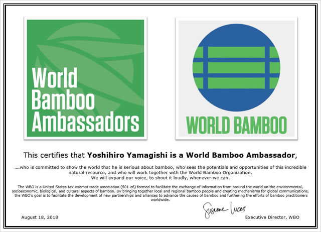 WBOの協力者である世界竹大使45名の中の一人として選ばれたことを機に、これからますます竹文化の創造と発信に努めてまいります。