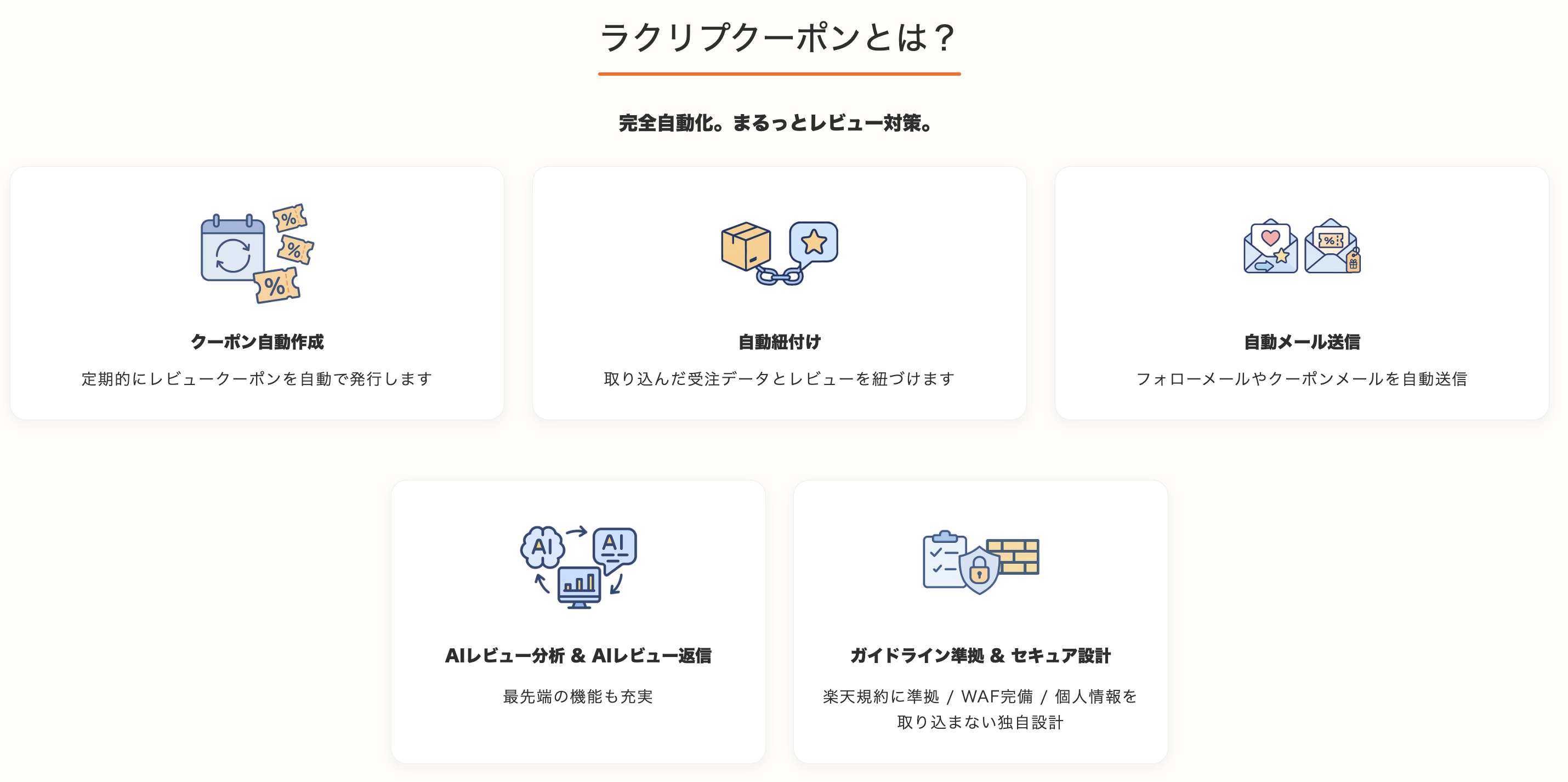 本サービスは、レビュー獲得とクーポン運用を完全自動化し、業界最安水準の価格でAIを活用した次世代EC支援を実現します。