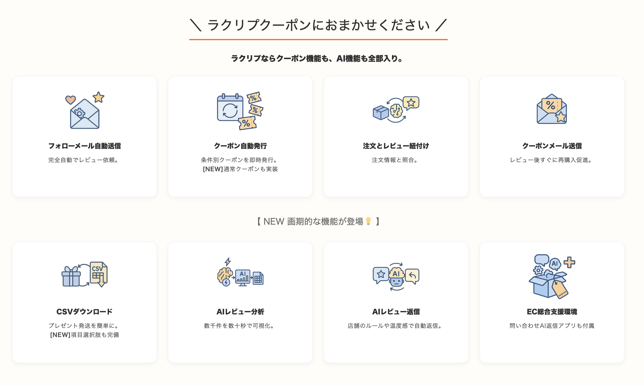 本サービスは、クーポン自動作成・発行、受注データとレビューの自動紐付け、そしてフォローメールやクーポンメールの自動送信を完全自動化し、EC運営の効率を劇的に向上させます。