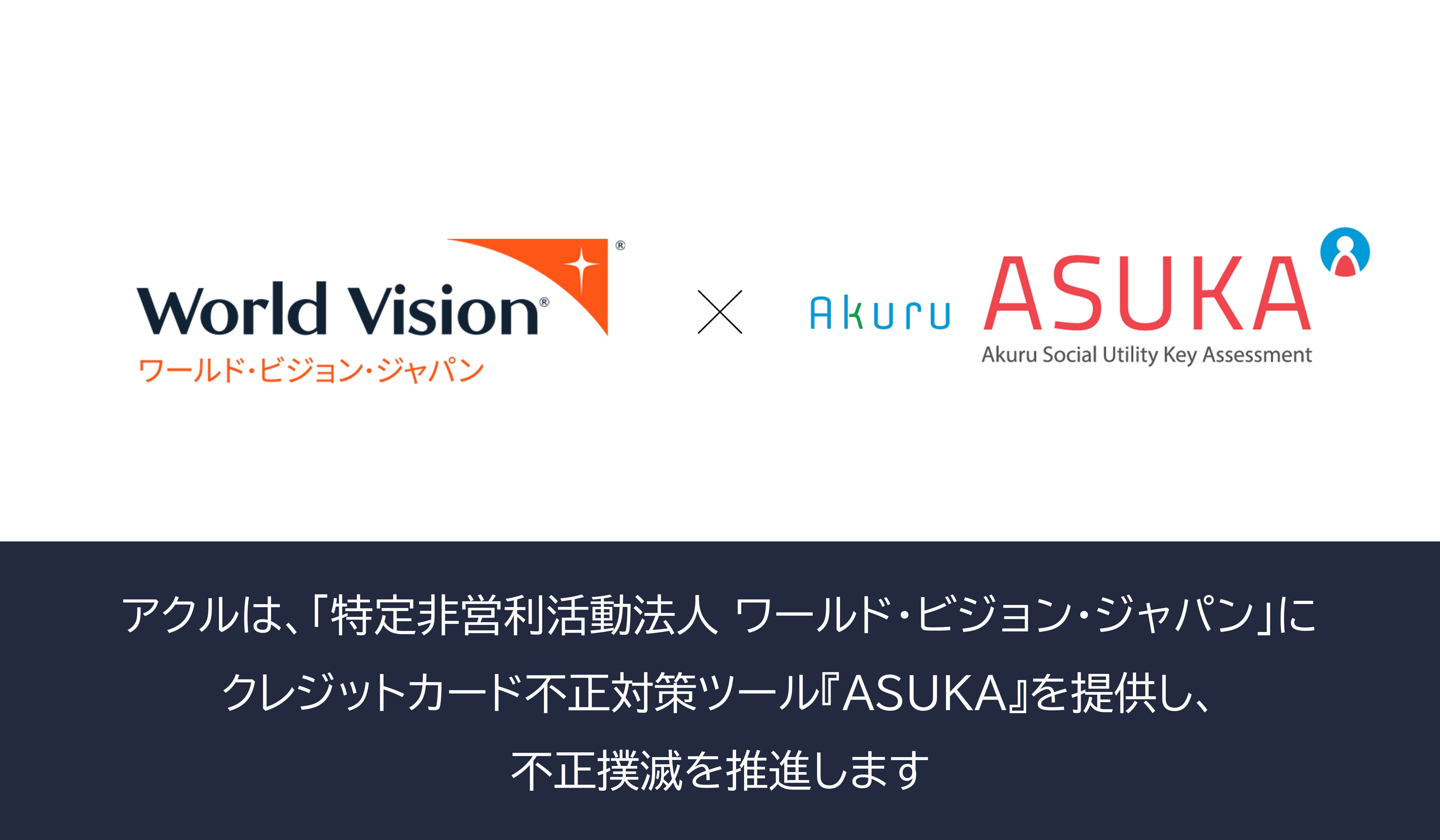 クレジットカード決済などの不正利用対策ソリューションを提供する株式会社アクル(本社:東京都港区、代表取締役社長:近藤 修、以下「アクル」)は、特定非営利活動法人 ワールド・ビジョン・ジャパン(京都中野区、事務局長:中島みぎわ、以下「WVJ」)の公式ウェブサイトへの不正検知・認証システム「ASUKA」の提供を開始しました。