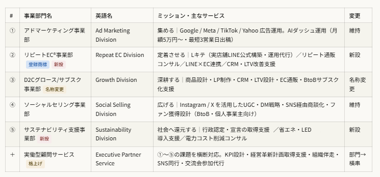 従来「D2Cグロース事業部」として運営してきた部門を「D2Cグロース/サブスク事業部」に改称します。健康食品・化粧品などEC通販支援に加え、BtoB向けサブスク化支援・リード型商材への対応が急増したことを受け、実態に即した名称に変更します。英語名はGrowth Divisionとしてシンプルに統一します。