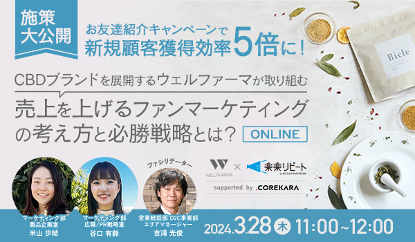 自社製造のCBDブランドを複数展開する「ウェルファーマ」のマーケティング部商品企画室米山様とマーケティング部広報/PR戦略室谷口様をゲストとしてお招きしたトークセッションセミナーです。