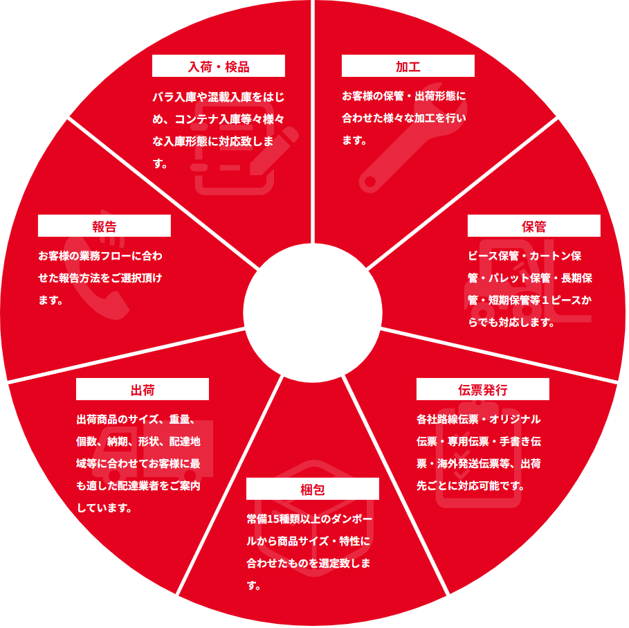 私たちはシステム環境や物流環境フルサポートする事はもちろん、販売経験を持つ物流企業としてお客様のビジネスを理解し、物流一体となった販売戦略の提案を行うなど、物流だけでなくお客様にとってメリットが生まれる範囲までお手伝いをいたします。